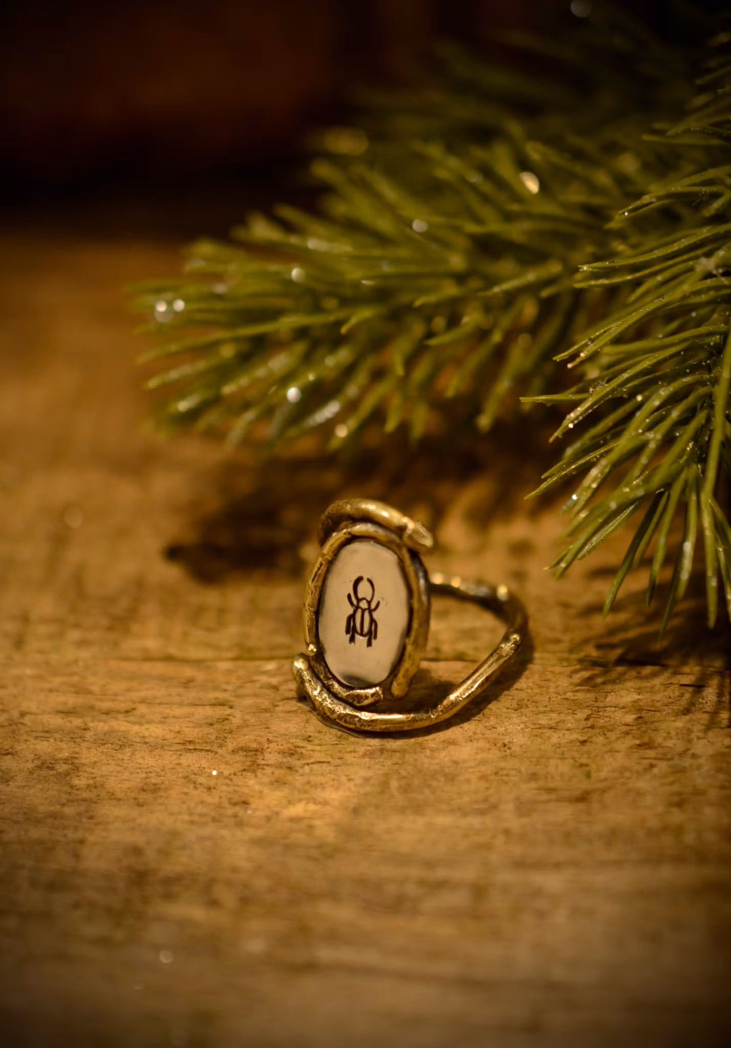 Ringen är gjord i oxiderad silver och mässing för att få en antik finish. Grenarna sveper runt fingret och omfamna amuletten. Jag ville mässing grenarna skulle ha ett knotig och organisk uttryck. Det ska påminna om tunna grenar man bryter av och leker med mellan fingrarna.